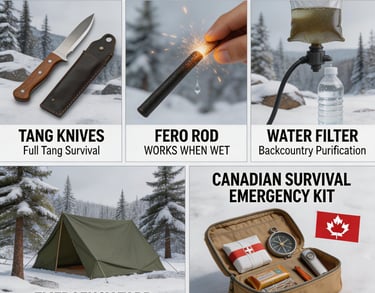 We stock full-tang knives, ferro rods that work when wet, water filters, tarps, and emergency kits proven in real Canadian survival situations.